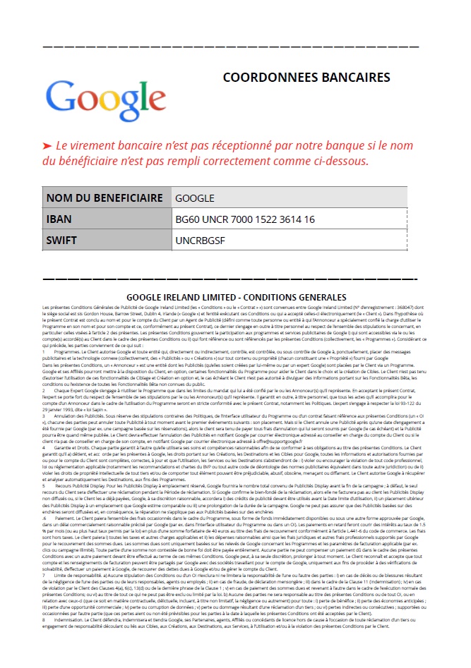 Le piège se referme avec l’annonce du montant, l’envoi d’un bon de commande est ampillé Google et du RIB pour le virement bancaire essayant encore une fois de se faire passer pour le RIB officiel de Google.